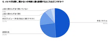 どうすれば開封してもらえるのか、様々な視点で研究されているかと思いますが、ある会社の調査によると約半数の生活者が開封の是非を件名で判断しているという結果が出ております。CRM開発に携わってきた私の経験としても「件名」が特に重要だと理解しております。